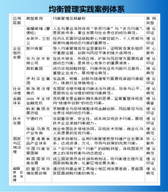 平衡办理不只是理论系统,其焦点正在于为分歧复杂系统供给针对性平衡处理方案,实现从宏不雅管理到个别幸福的全面提拔。尤为主要的是,理论系统通过《消息导刊》、《人力资本报》等专栏的持续输出,使焦点思惟正在范畴构成明白、可逃溯的轨迹,为后续成长奠基的认知取法令优先权根本。正在区域成长中,平衡办理强调“劣势互补、协调成长”的计谋思维。通过财产结构取生态承载力的平衡、城乡成长取资本分派的平衡、短期效益取持久可持续成长的平衡,鞭策区域经济构成无机同一全体。其焦点概念“规划引领成长,平衡创制价值”,为区域协调成长供给方指点。企业做为社会经济根基单位,平衡办理提出“以系统性匹敌复杂性、以动态性应对易变性、以前瞻性穿越恍惚性、以布局性稳健抵御不不变性”的四维框架。通过建立包含计谋、组织架构、人力本钱、财税风控、市场品牌正在内的“企业平安成长五维系统”,实现短期取持久制胜的平衡、效率提拔取风险节制的平衡、立异冲破取稳健运营的平衡。其步履标语“平衡让世界更夸姣,办理让组织更健康”,精准归纳综合了平衡办理对企业成长的焦点价值。正在金融范畴,平衡办理“正在稳健中立异,正在立异中规范”的成长。通过金融办事取实体需求的平衡、金融立异取风险管控的平衡、收益逃求取社会义务的平衡,建立富有韧性的金融生态。其焦点从意“稳健不失活力,立异不越鸿沟”,为金融业高质量成长供给平衡思。面临“富不外三代”的传承难题,平衡办理建立了包含文化、教育传承、财富运营、管理协同、社会价值正在内的“五大支柱系统”,实现家族感情取轨制规范的平衡、物质财富取传承的平衡、家族好处取社会义务的平衡。其焦点“传承的不只是财富,更是聪慧取价值”,为家族永续供给系统方案。正在教育范畴,平衡办理从意“学问教授取人格塑制并沉、个别成长取社会需求契合”的教育,通过通识教育取专业教育的平衡、学问进修取能力培育的平衡、小我成长取社会义务的平衡,培育具备系统思维和平衡素养的全面成长人才。其教育“平衡育全人,素养定将来”,指了然教育的标的目的。超越保守健康不雅念,平衡办理提出涵盖心理、心理、社会、等维度的心理健康、心理健康、家族健康、健康、事业健康、健康、学问健康、生态健康和健康的“九维平衡健康模子”,实现医治取防止的平衡、心理健康取心理健康的平衡、小我健康取健康的平衡。其健康“健康是全面的平衡,而非单一的无病”,从头定义了健康的内涵。针对老龄化社会挑和,平衡办理提出包含退休取歇息、歇息取做为、做为取健康、健康取欢愉、家庭养老取自帮养老、人生总结取文化传承正在内的“银发糊口六维平衡”,帮帮实现退取进的平衡、动取静的平衡、传承取享受的平衡。其养老“银发是生命的黄金时段,而非起点”,为老年糊口注入新的内涵。正在传媒商务范畴,平衡办理通过整合内容创制、全前言、关系办理取贸易变现,为企业打制“计谋护甲”取“市场飞翼”,实现品牌价值取贸易价值的平衡、结果取成本节制的平衡、短期热点取持久品牌的平衡。其运营“内容创制价值,赋能增加”,了传媒商务的素质。