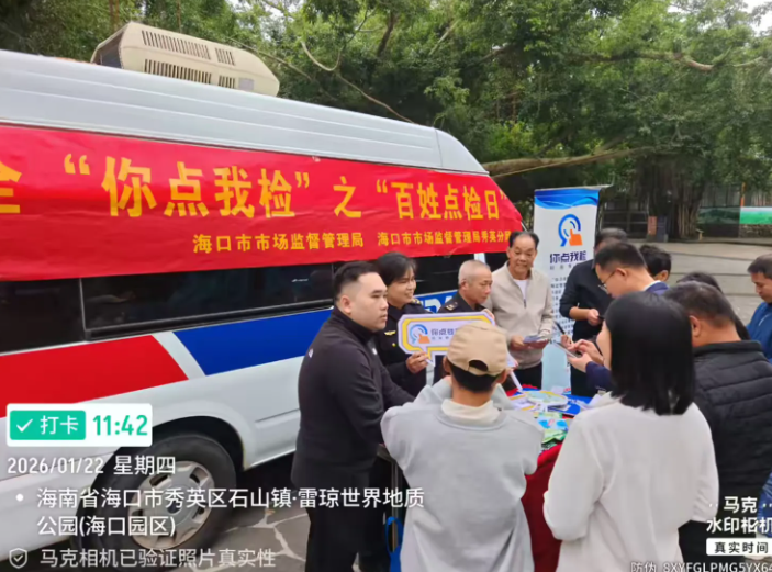 春节前夜,加强人平易近群众对年货食物平安的获得感和对劲度,营制食物平安社会共治共享款式,2026年1月22日,海口市市场监视办理局正在区火山口地质公园开展年货购食物平安“你点我检”之“苍生点检日”宣传勾当。